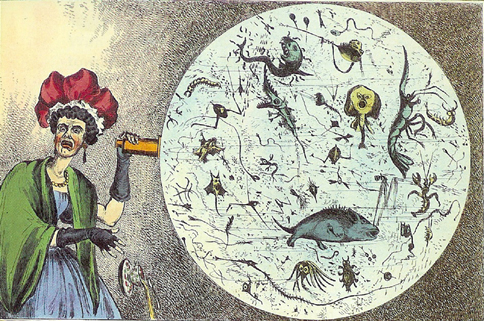 A woman is dropping her tea-cup in horror upon discovering the monstrous contents of a magnified drop of Thames water. In the nineteenth century, sewage and waste contaminated the River Thames in London, making it a prime source of water-borne diseases such as cholera and typhoid.
