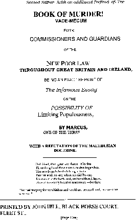 ![]() Christian Reader Be not alarmed at the sound of the title. I can not bless that, which GOD and NATURE CURSE. The Bible being true, the Poor Law Amendment Act is false! The Bible containing the will of God, - this accursed Act of Parliament embodies the will of Lucifer. It is the Sceptre of Belial, establishing its sway in the Land of Bibles!! DAMNATION, ETERNAL DAMNATION to the accursed Fiend!! Damnation, Eternal Damnation (1837), frontispiece |