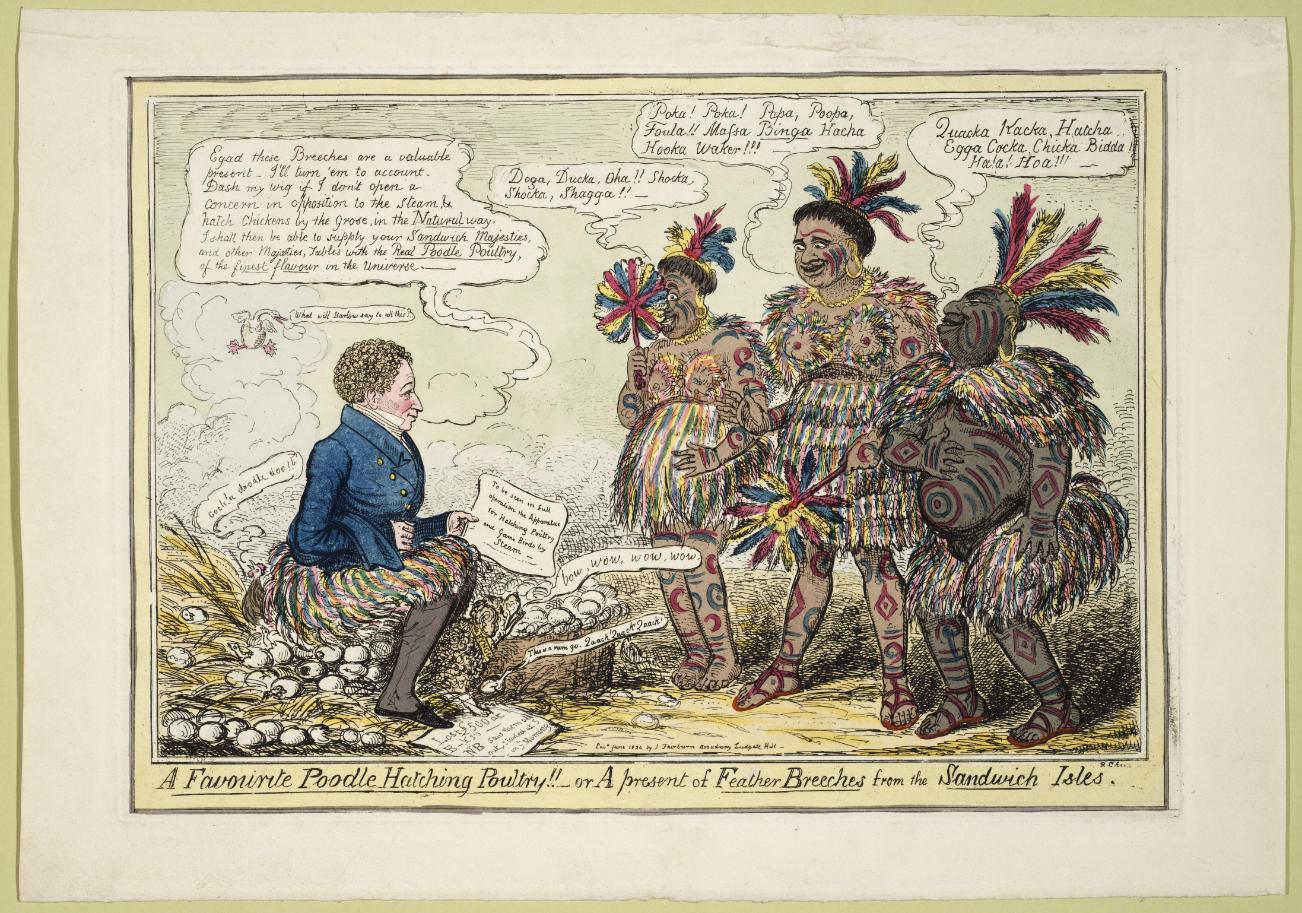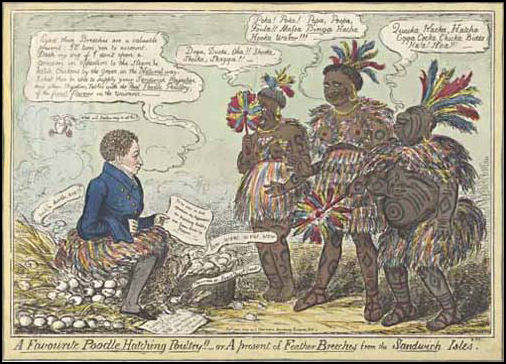 This Cruikshank cartoon shows Byng wearing a Hawaiian grass skirt, sitting on a pile of eggs from some of which chicks are emerging; facing him stand the three Sandwich Islanders in feathers and paint: the King and Queen and (presumably) the Governor, Boko, who is shorter, older, and less feathered than the royal pair; all stare and laugh. Byng wears a feathered Sandwich Island kilt, with his blue coat; in his hand is a paper on which is written, "To be seen in full operation the Apparatus for Hatching Poultry and Game Birds by Steam". Byng was an inveterate gambler at "Brooks", and a note at the base of the print refers to gambling losses of £500. Byng invested in a steam hatching invention.