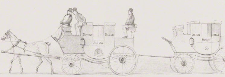 This cartoon was produced by John Doyle on 10 August 1835: it is called "The Derby Dilly taken in tow by the Patent Safety".