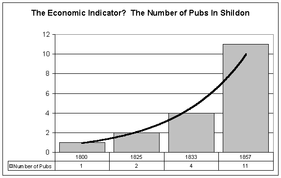 Similarly, Figure 2 shows the known number of pubs in the area, with a similar trend line. The number of pubs has been used as a rough economic indicator because pubs tend not be opened, or stay open, if there is insufficient wealth in the area to sustain them. Also, it seems to be the one statistic that the locals constantly record.