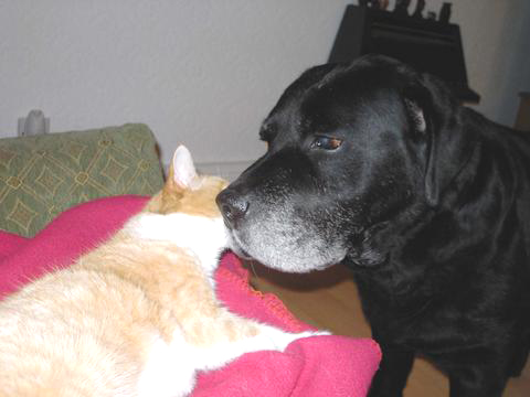 This boy was never small; he weighed around 6.5 stones (91 lbs or 42 kgs) when he was fully grown. He was in the "friendly" queue when brains were being distributed - he would lick anyone to death! Where food was concerned, Pavlov would have been proud of him. Raq was the last of the pets to arrive - and the first to go. He loved to cuddle up to Suzie; he enjoyed being spoiled by her - she spent a lot of time washing his face. Raq tried to make friends with Wellington but with little success.
